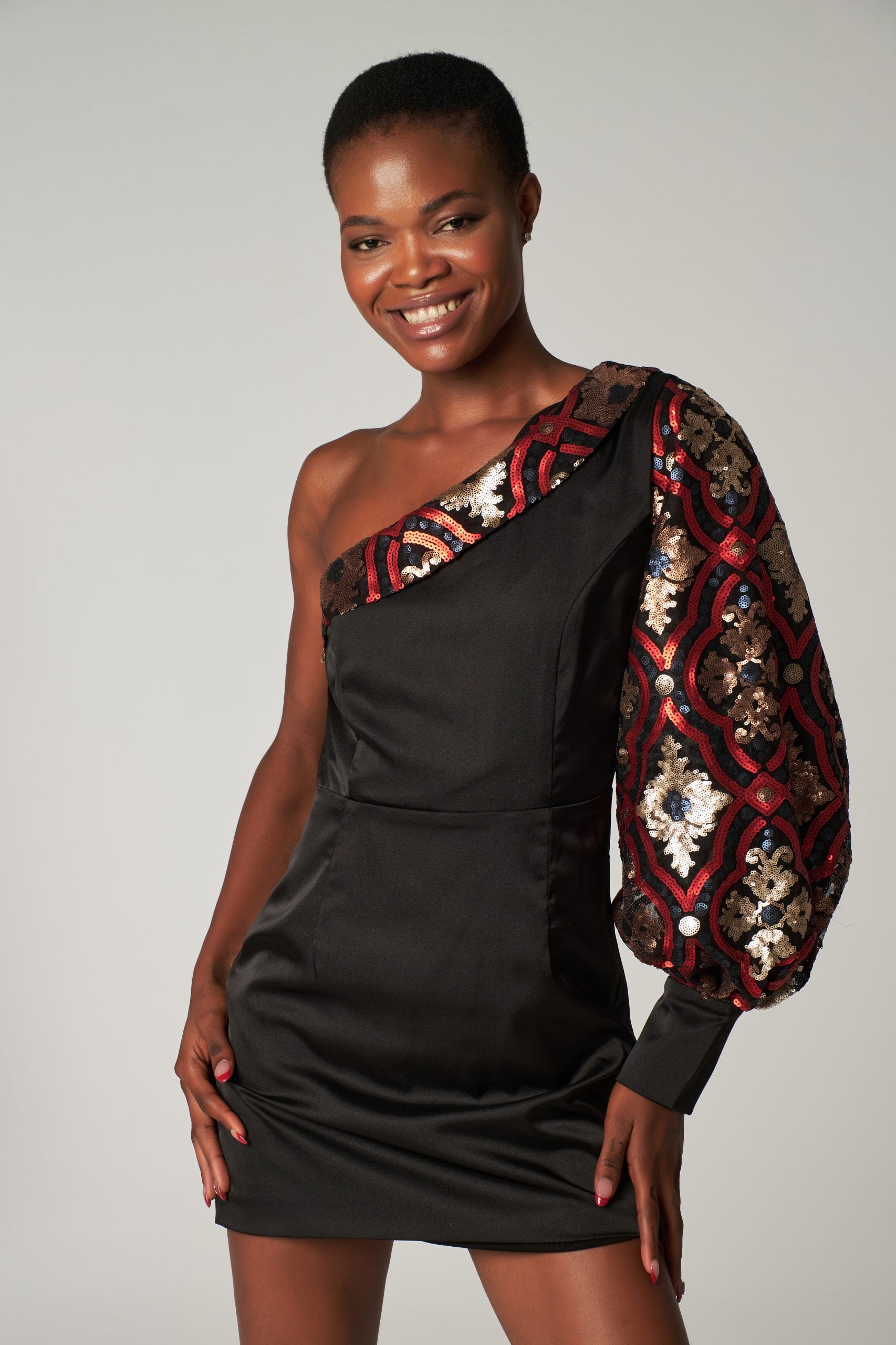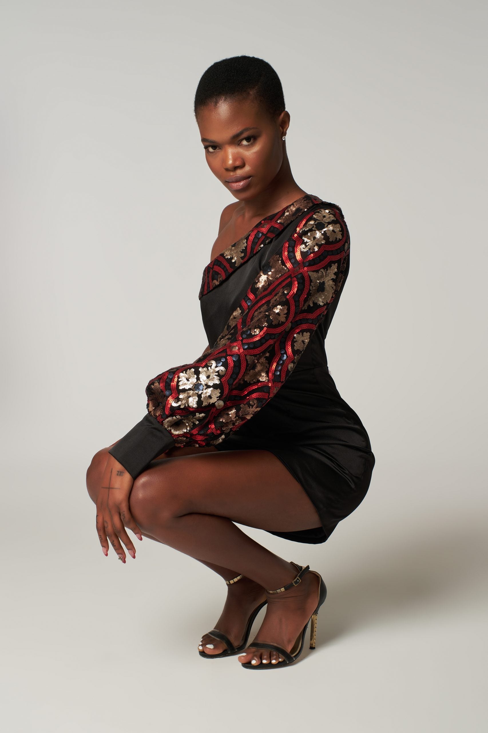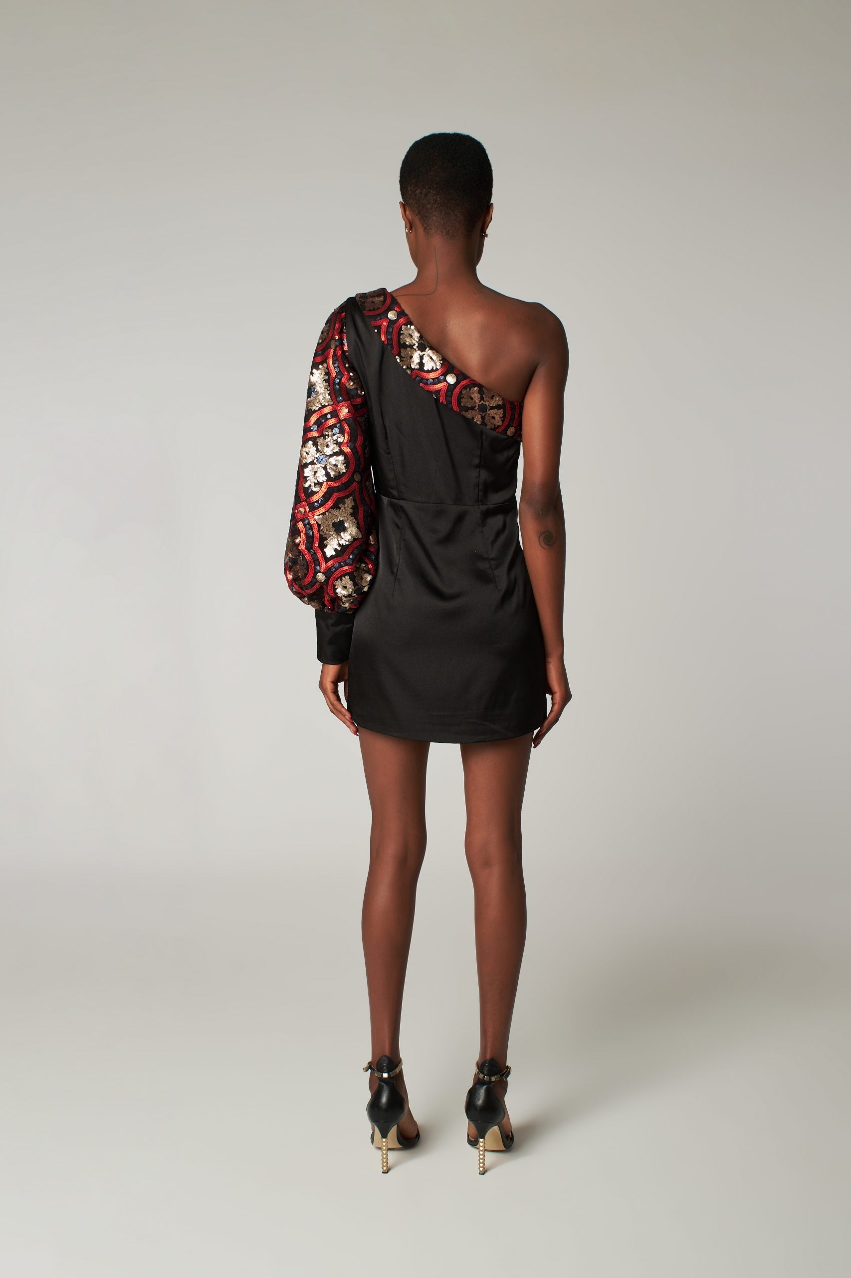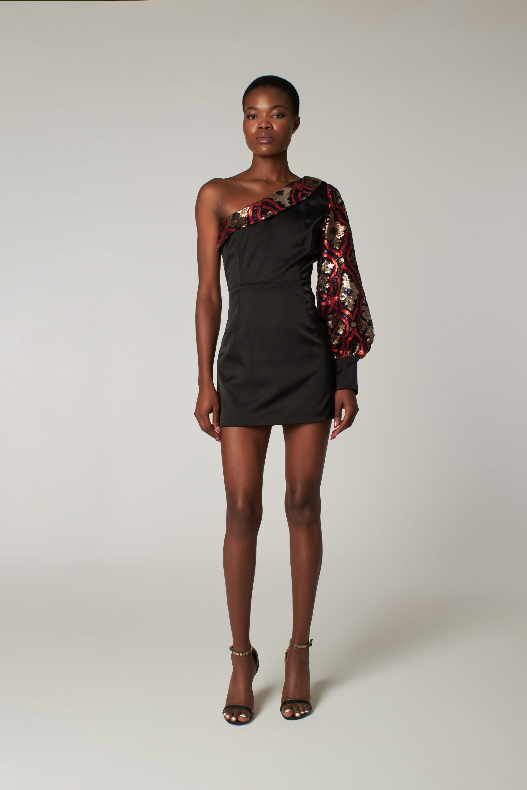 Make an entrance in the this dress. This one shoulder High Quality Sequin Embellished Red with Gold sequin Mini dress is a modern rendition of disco glam.Feel fierce in our dress, made of semi-lycra fabric , with a a single long sleeve and flawless collar detail .