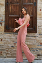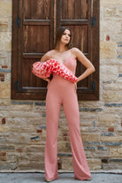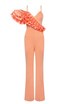 Our jumpsuit is tailored from semi-lycra fitted fabric, and decorated with an asymmetric layered ruffle, and corset lacing at the back. It is a fitted cut. Perfect for any occasion, from day events to evening parties.