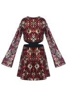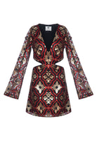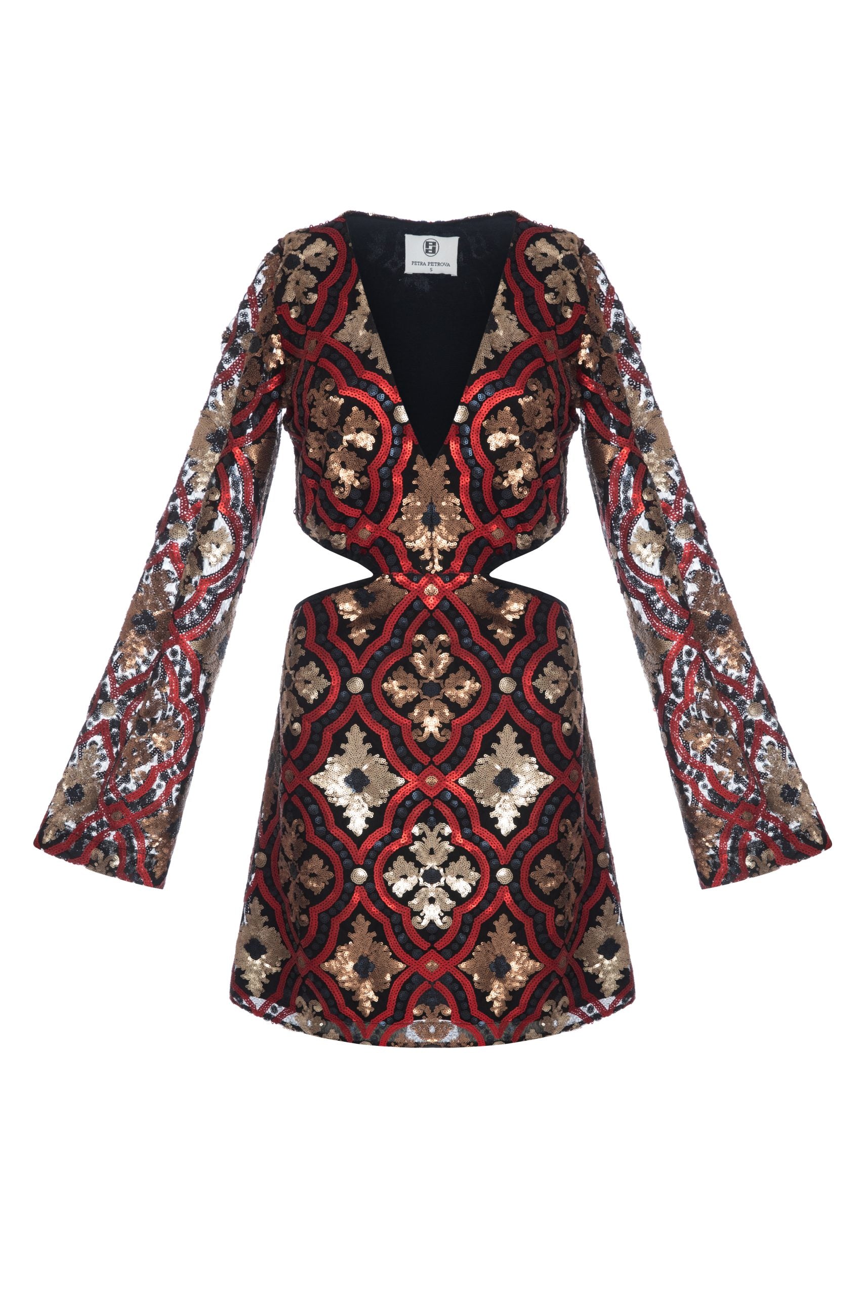 This glistening mini dress by is adorned with gold and red sequins on black for a glamorous party look. Long sleeves and side cut-out detailing add a sense of drama to its eye-catching silhouette.