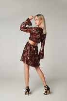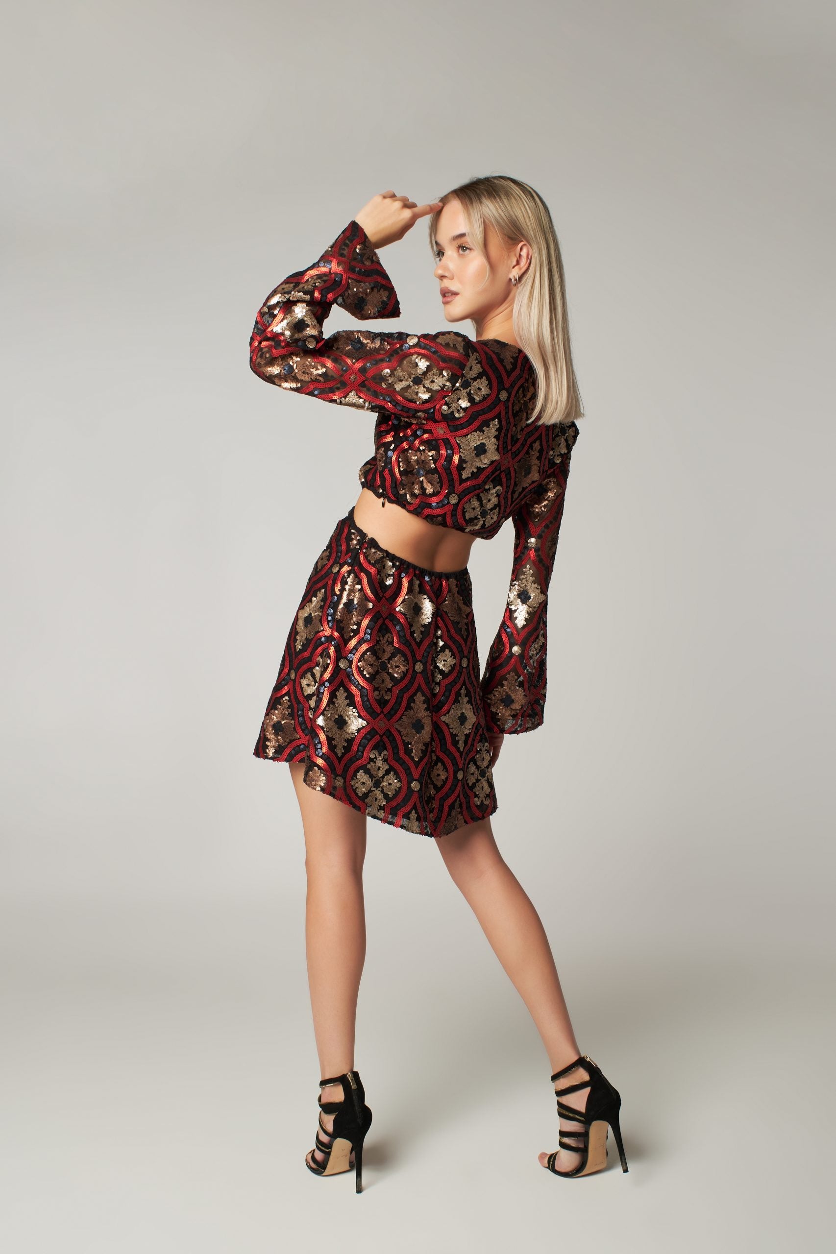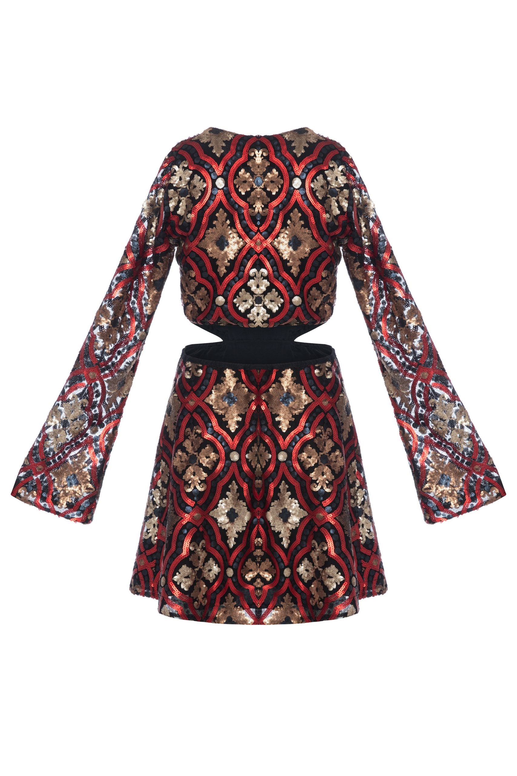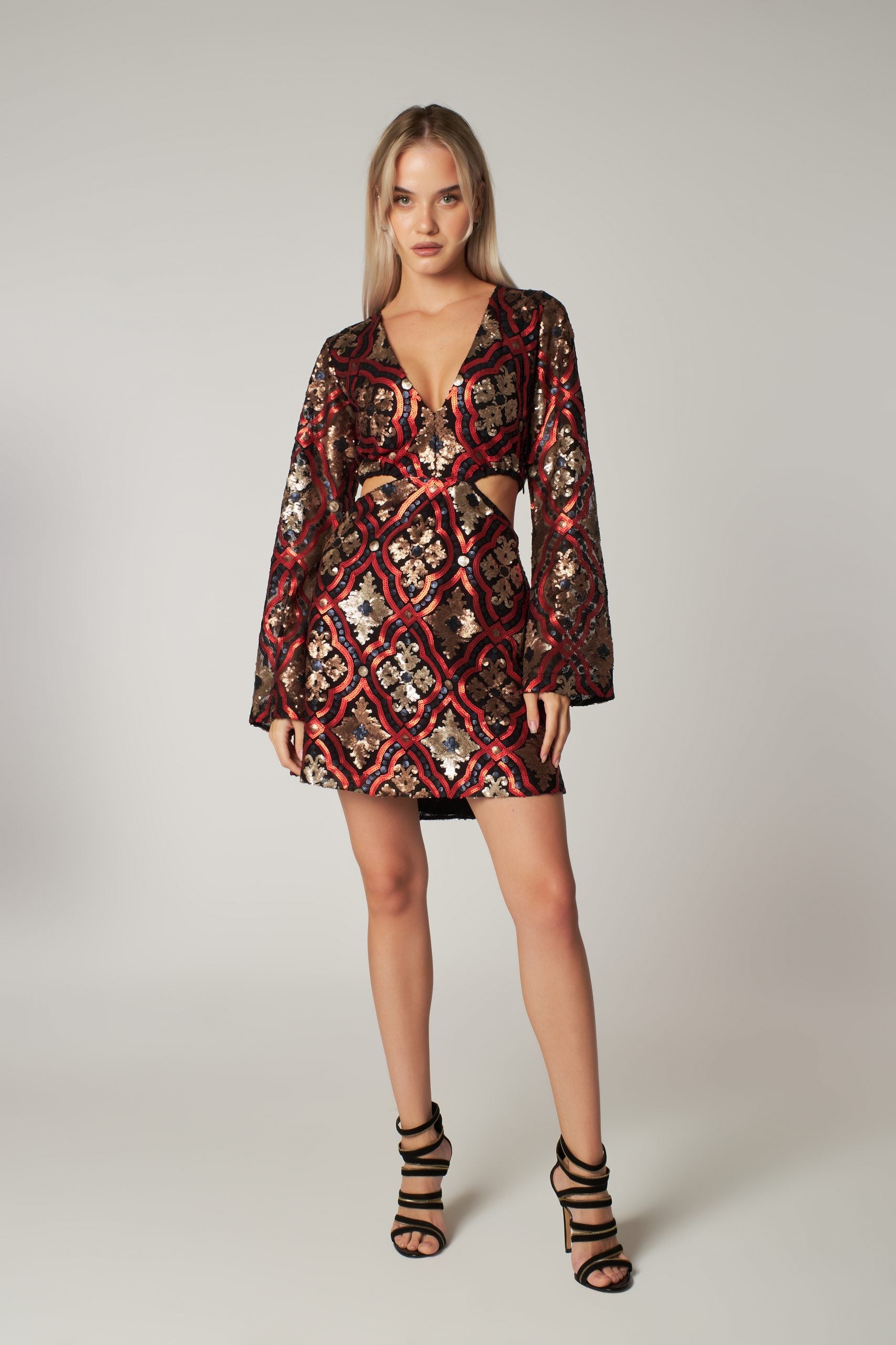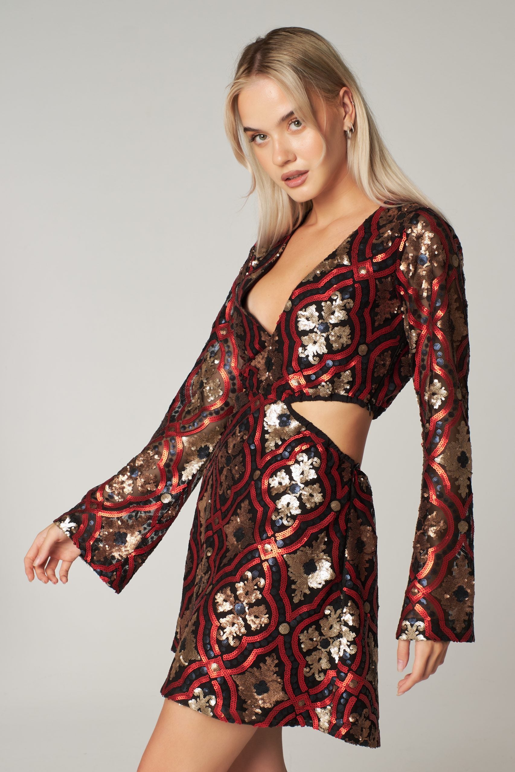 Red Sequin Long Sleeve Cut Out Mini Dress LERA