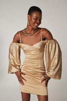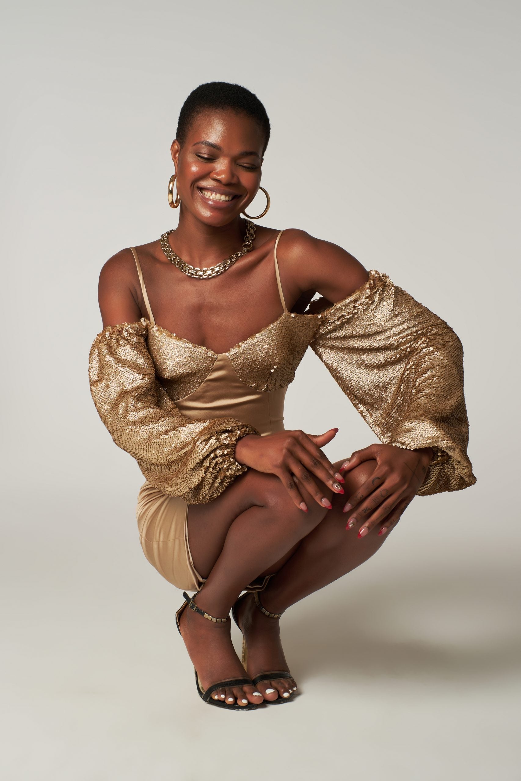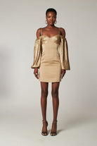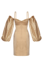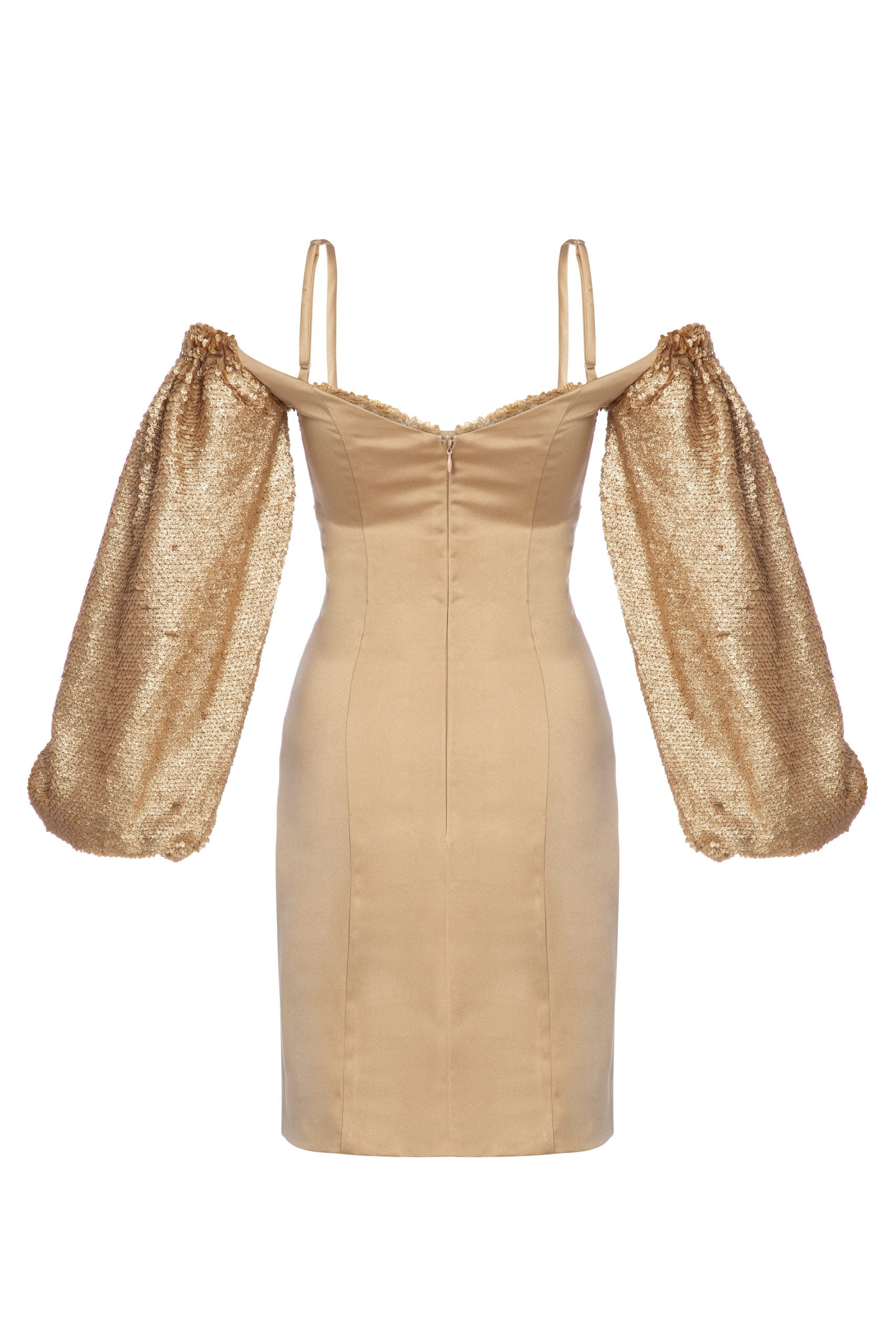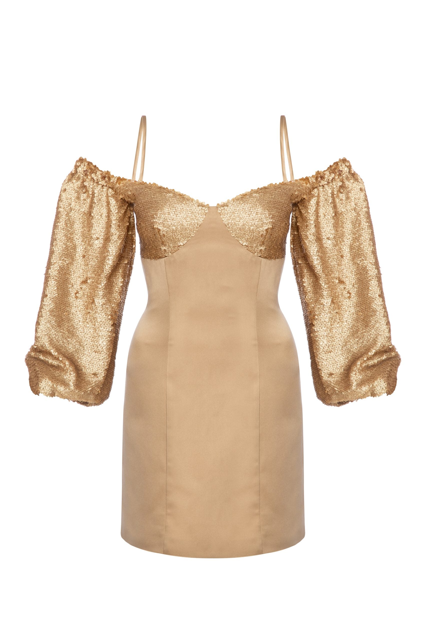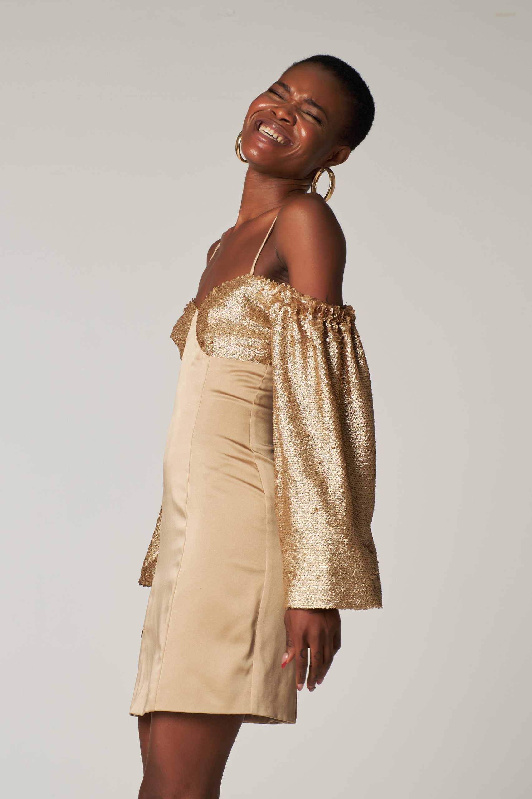 Make an entrance with Off the shoulder High Quality Embellished Gold sequin Mini dress with adjustable straps . The dress is made of semi-lycra fabric. Feel the glam in this gorgeous  dress, with premium tailored Sequin Embellished Dress  .