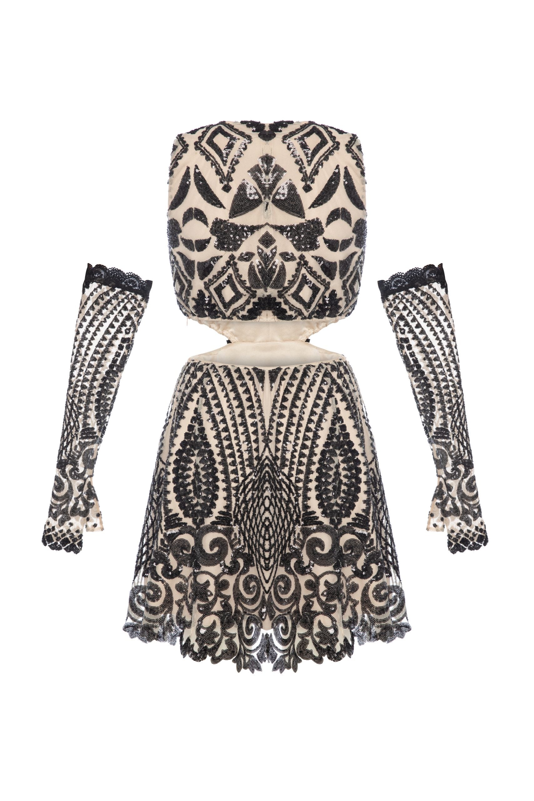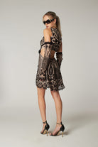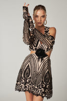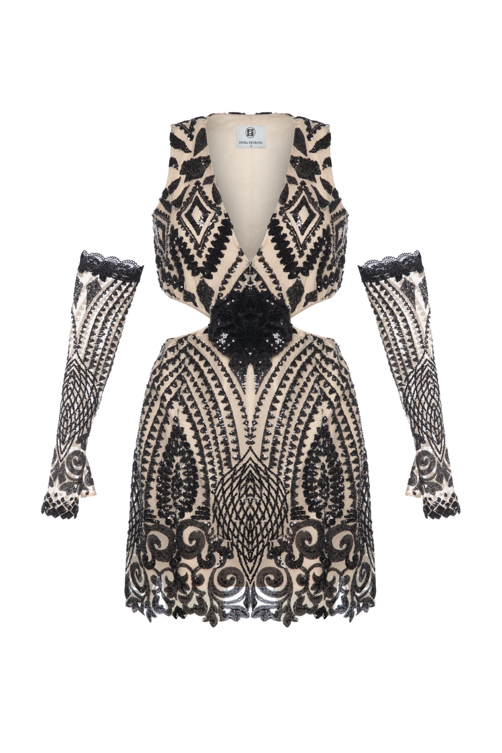 Feel like the centre of attention in our mini dress, made in black sequin fabric on nude beige , with flared silhouette and flirty cut out details and flower accent on the V - cut neckline . You can wear it with or without gloves , which gives the look more drama effect.