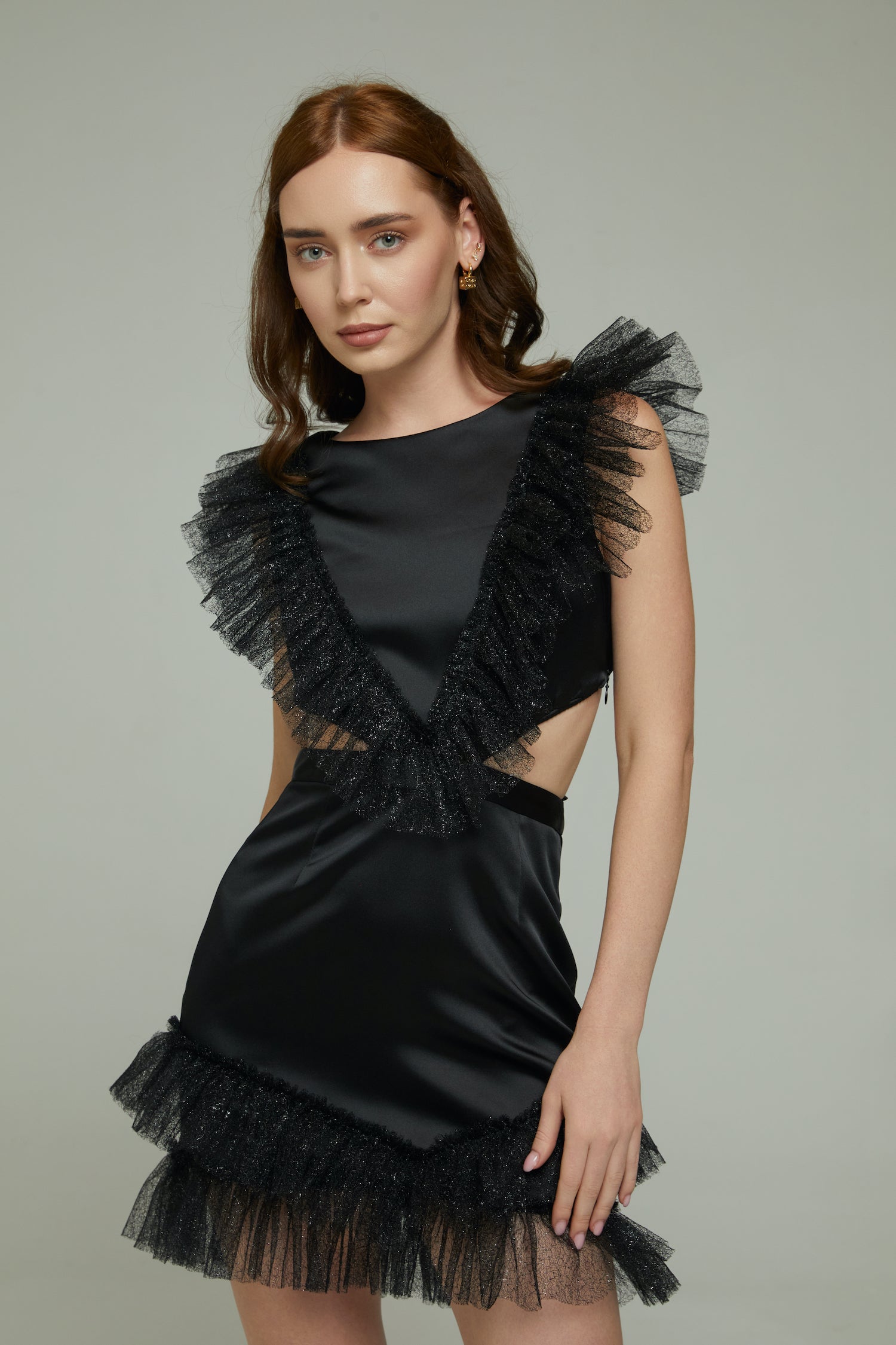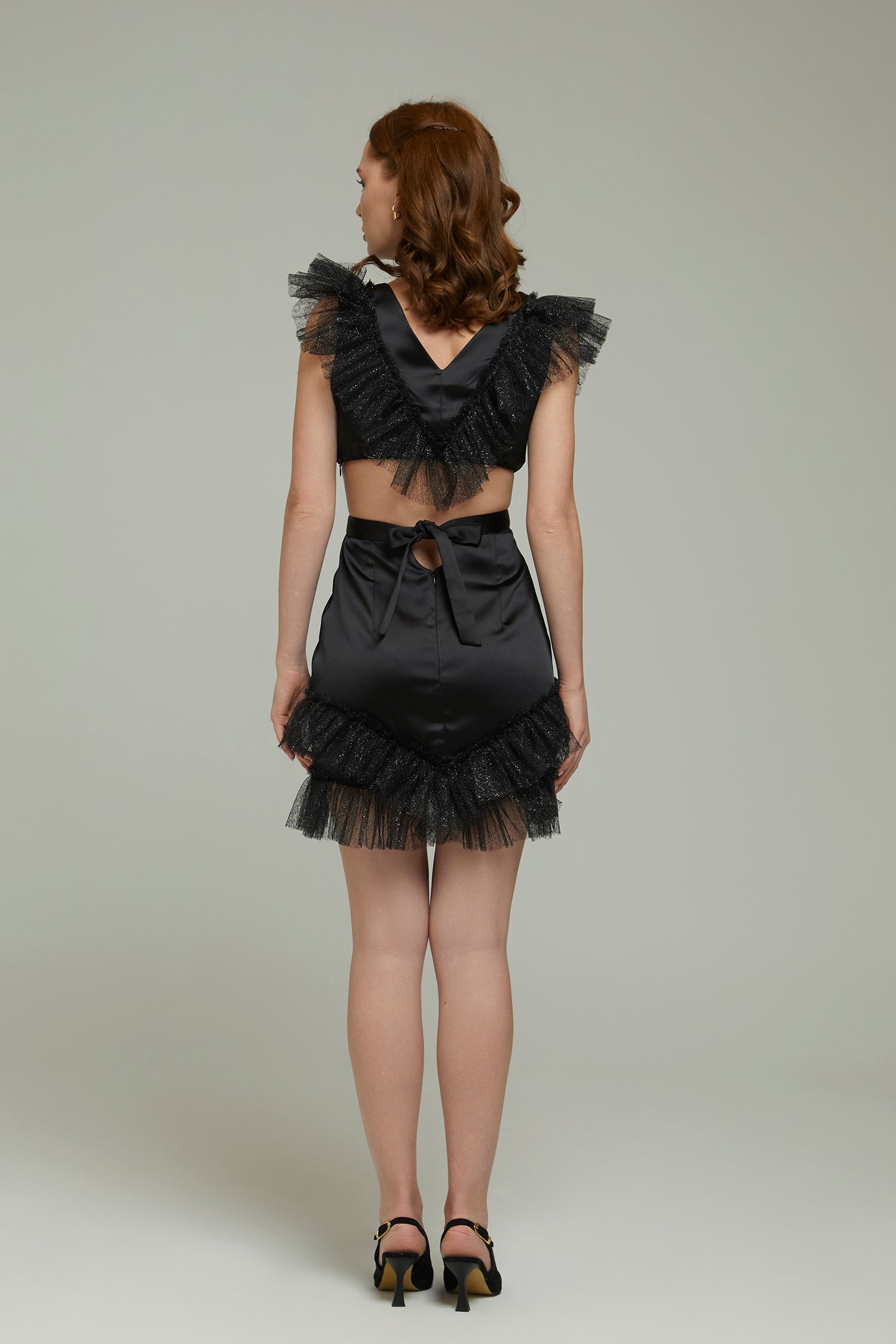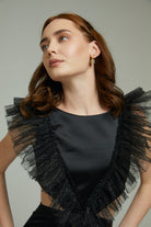 Black Ruffle mini dress decorated with pleated details .The cut-out at the waist, accentuating your figure beautifully .Featured hidden elastic band at the top of the dress ,that provides extra confort .Tailored from from Premium materials . Features a tin belt at the waist of the skirt, can be tied comfortably at the back ,invisible side zipper and A-line skirt shape .It’s perfect for gala evenings, high-end events, or any occasion where you want to make a luxurious impression. Totally lined Limited Edition item .