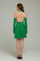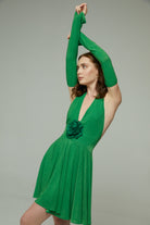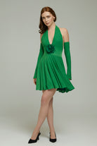 Dazzle in shimmering elegance with the flare Marilyn dress decorated with crystals and with flower detail at the front . This dress is designed with a halter neckline and an elegant waist detailing with button and zip fastening at the back . Fully lined for a polished finish and added coverage. The daring green color and the shimmering finish ensures you stand out at any event. This dress comes with the long gloves for extra head-turning look.Limited Edition item .