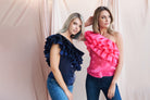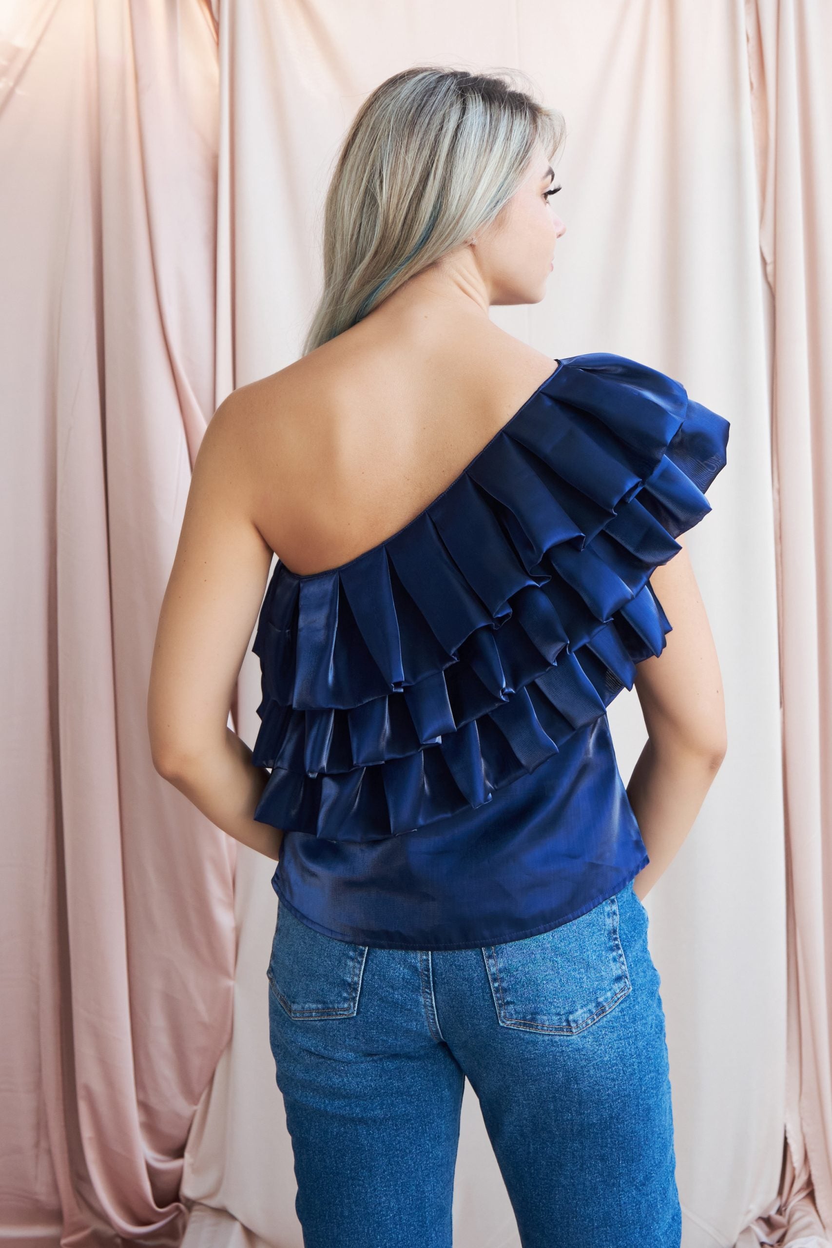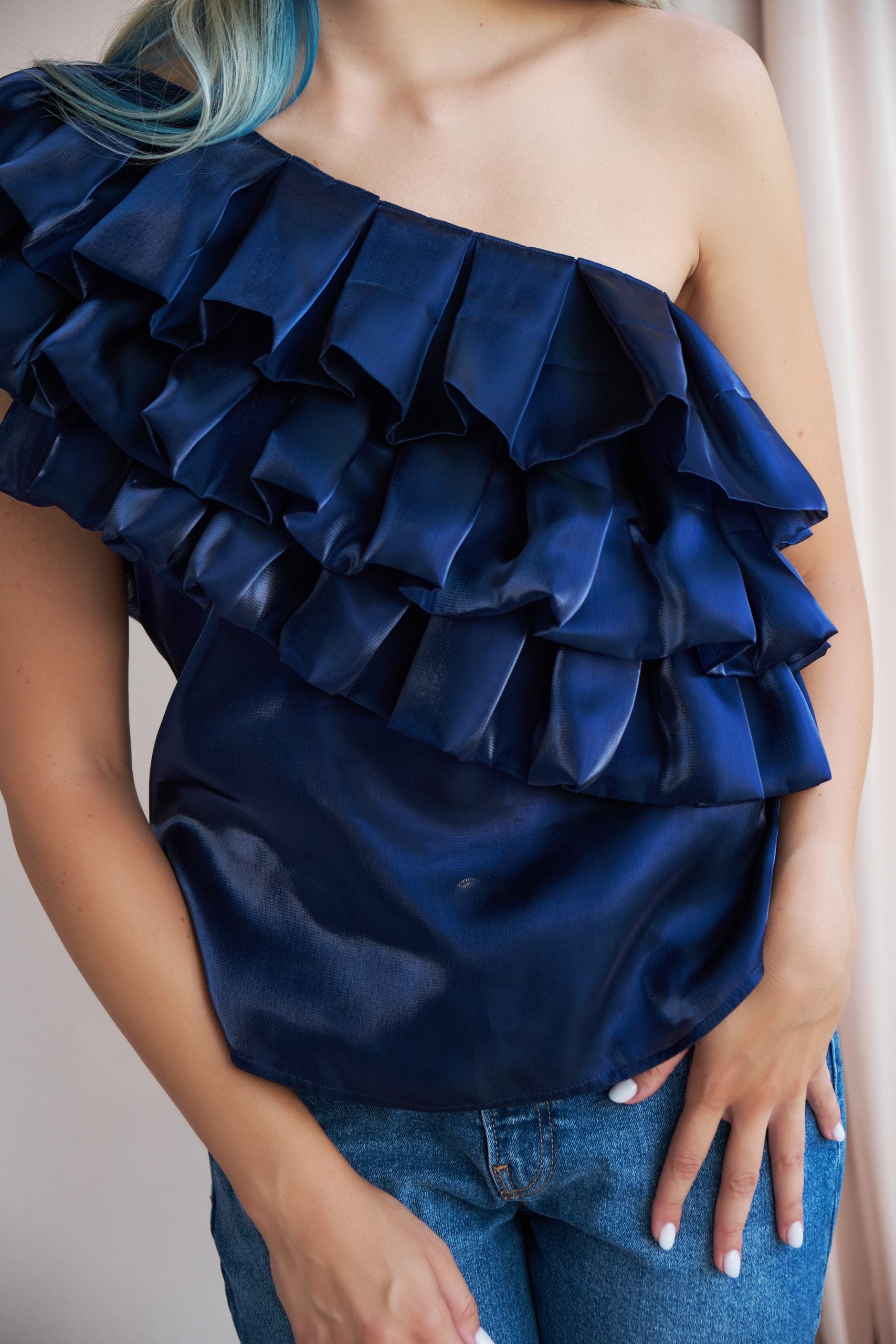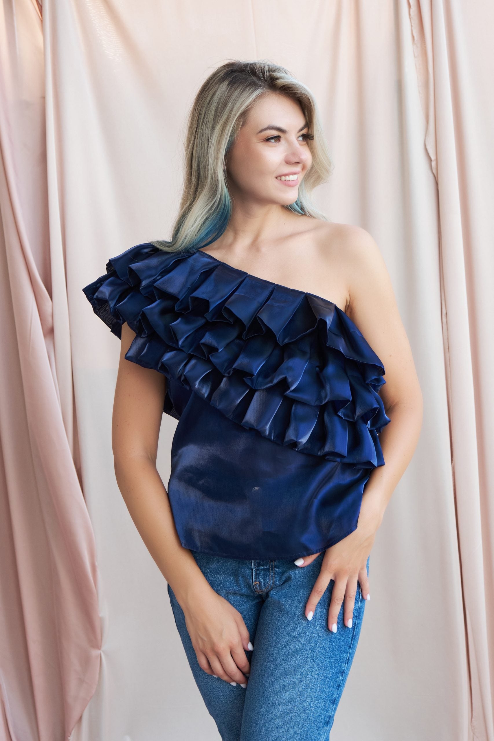 Organza blouse with one shoulder has an invisible zipper on the side. This fabric is see-through and really delicate.
