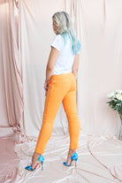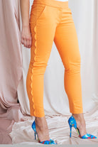 Orange slim-fit trousers. It is a low-waist product. There are pocket details on the front and back. There are asymmetrical wave details on the sides.