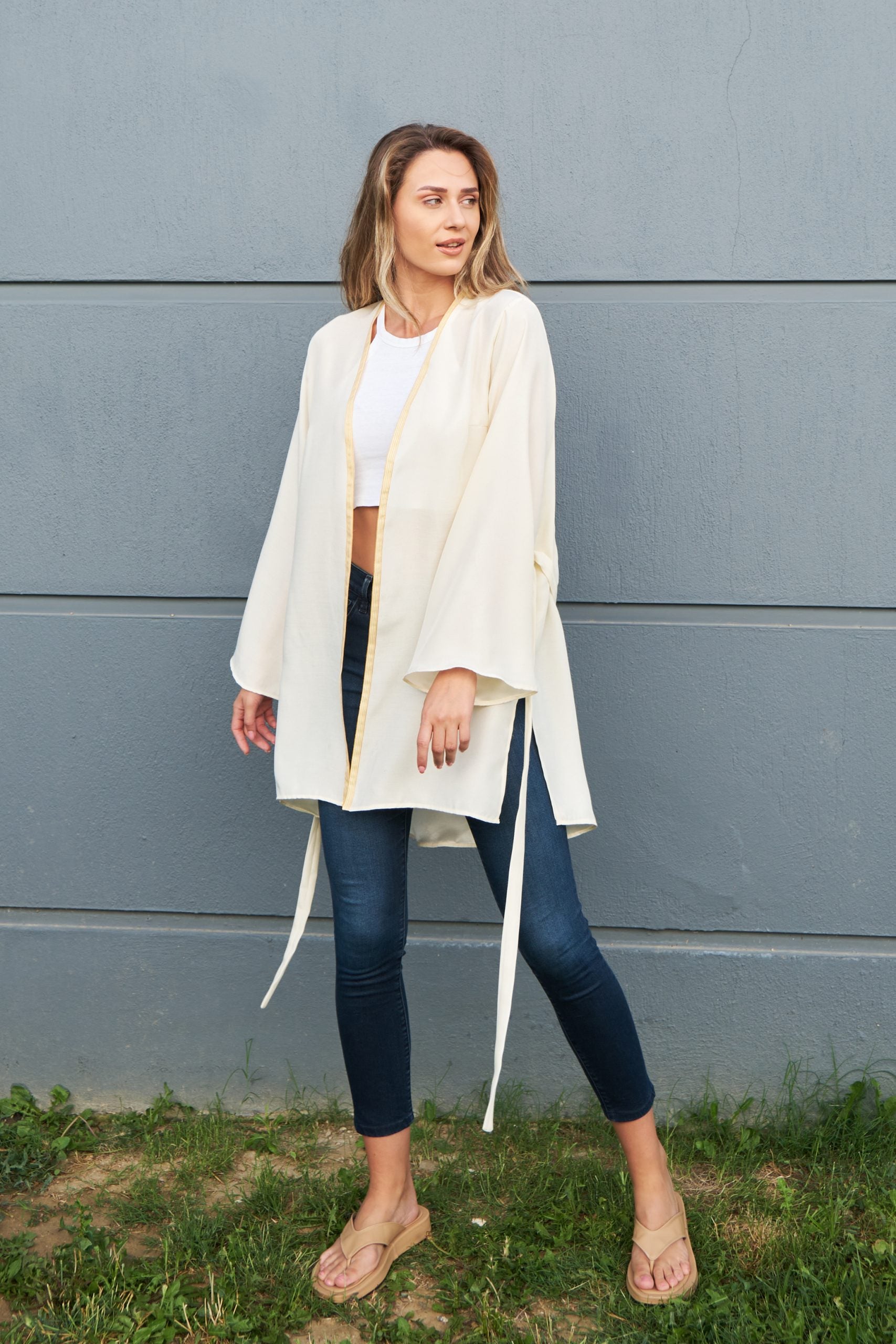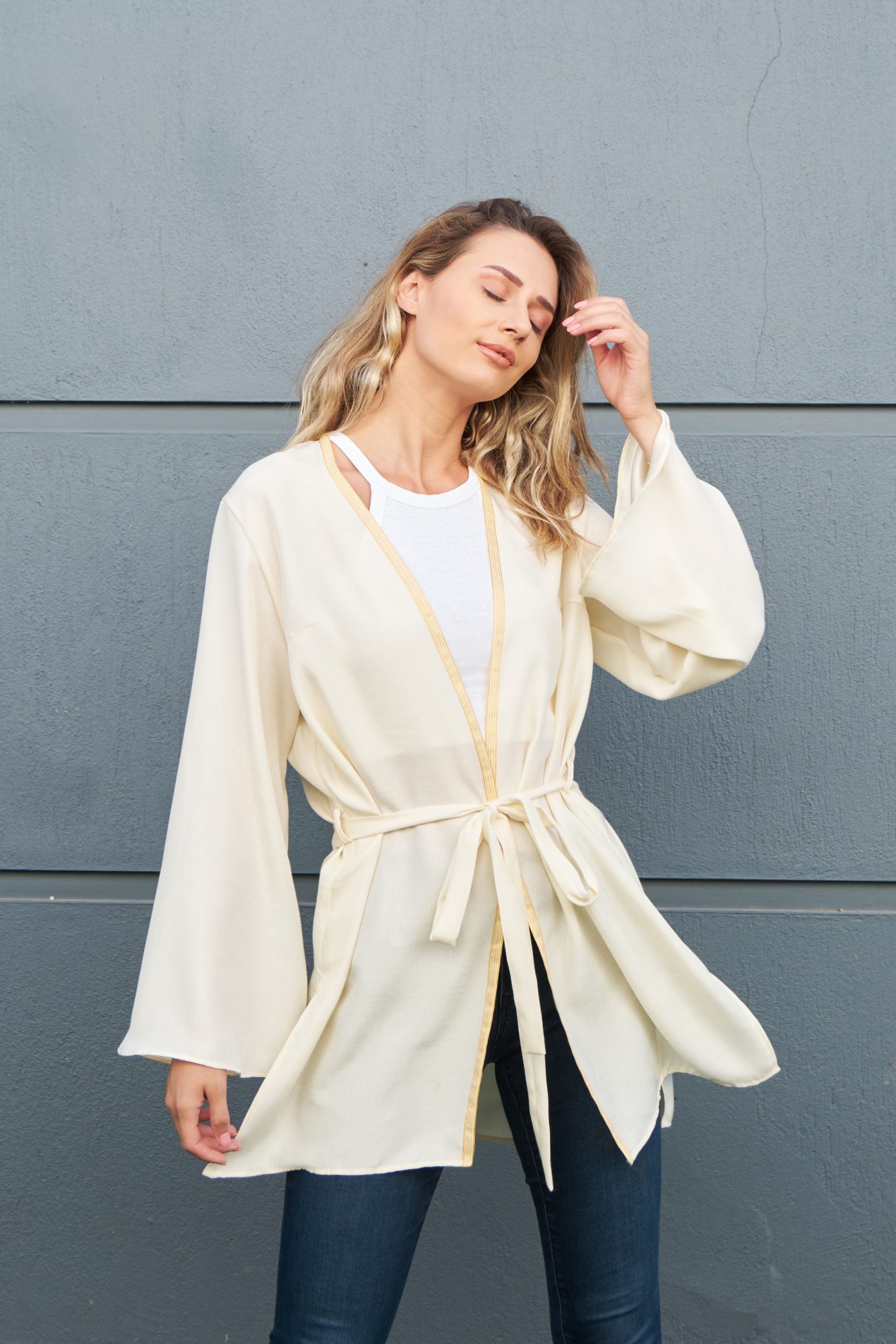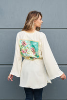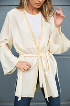 Champagne-color oversize kimono with a detectable belt. A must-have piece item for summer, it can be easily styled with jeans or used with a swimsuit. It will attract all the attention with its rose embroidered detail on the back.
