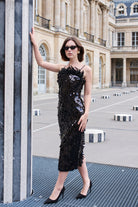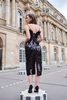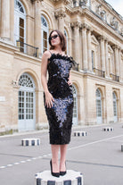 Feel like you are the center of attention with our midi dress made of unique premium quality sequin embellishments . This dress can be worn with or without feather detail with easy removable invisible buttons on the bustier collar. The well-fitted bustier has internal hidden Bones and can be adjusted to the desired comfort with back Fastening . The skirt is a samy-fitted cut and has a bold slit at the back of the skirt. This dress will be a perfect black dress with wow effect which you can wear to any kind of event from the day time to formal events , night outs or even as a wedding reception dress .