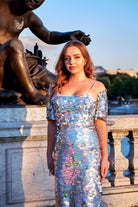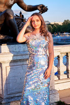 Feel like you are the center of attention with our midi dress made of unique premium quality sequin embellishments and styled with its own Bolero . This dress can be worn with or without feather detail with easy removable invisible buttons on the bustier collar. The well-fitted bustier has internal hidden Bones and can be adjusted to the desired comfort with back Fastening . The skirt is a samy-fitted cut and has a bold slit at the back of the skirt. This dress will be a perfect White dress with wow effect which you can wear to any kind of event from the day time to formal events , night outs or even as a wedding reception dress .