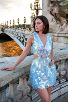 Stand out in our stunning mini dress made in high quality sequin fabric with Samy- flared silhouette , flirty cut out details and Bold flower accent on the V – cut neckline . The side cut out details on the bodice and the skirt features a hidden elastic at the waist , ensuring both comfort and style . The dress is also easy to wear with the invisible side zipper and to avoid the possible skin irritation from the payette fabric we carefully hand-beaded under-arms part and also around the neck . Feel like the centre of attention in our mini dress.