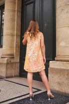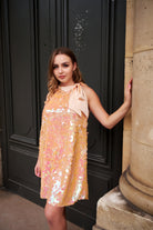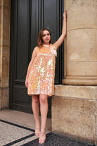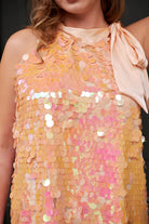 Bring some sparkle. Feel like the centre of attention in our sequin mini dress, with unique sequin fabric It is tied at the neck . Pair it with heels or cowboy boots for a look that will take you from flawless vacation looks to head turning.