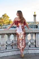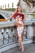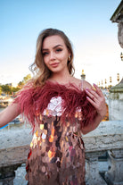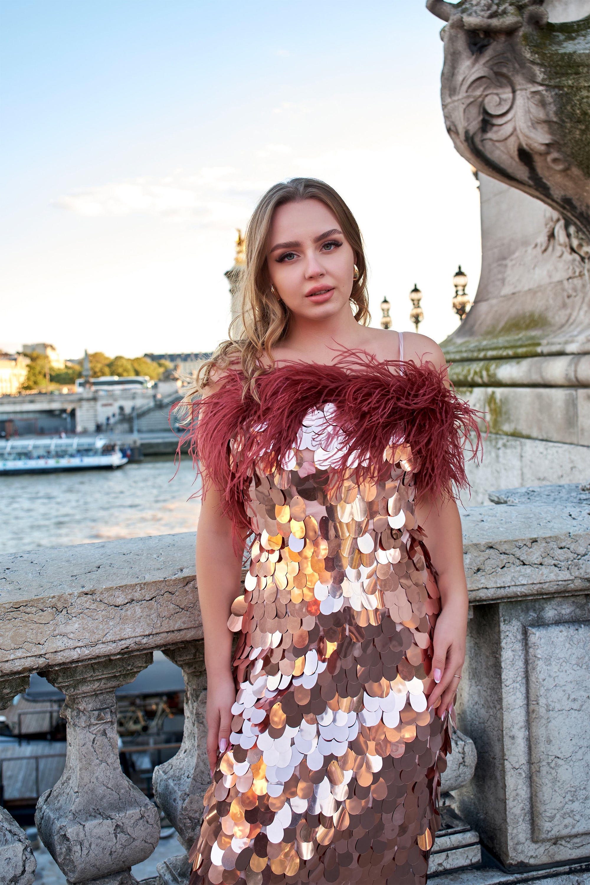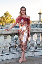 Feel like you are the center of attention with our midi dress made of unique premium quality payette embellishments . This dress can be worn with or without feather detail with easy removable invisible buttons on the bustier collar. The well-fitted bustier has internal hidden Bones and can be adjusted to the desired comfort with back Fastening . The skirt is a samy-fitted cut and has a bold slit at the back of the skirt. This dress will be a perfect dress with wow effect which you can wear to any kind of event from the day time to formal events and night outs.