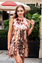Bring some sparkle. Feel like the centre of attention in our payette mini dress, with unique payette fabric It is tied at the neck . Pair it with heels or cowboy boots for a look that will take you from flawless vacation looks to head turning.
