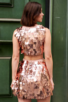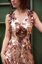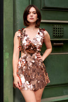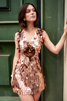 Stand out in our stunning mini dress made in high quality sequin fabric with Samy- flared silhouette , flirty cut out details and Bold flower accent on the V – cut neckline . The side cut out details on the bodice and the skirt has invisible elastic band inside that add extra comfort on the body . The dress is also easy to wear with the invisible side zipper and to avoid the possible skin irritation from the payette fabric we carefully hand-beaded under-arms part and also around the neck . Feel like the centre of attention in our mini dress.
