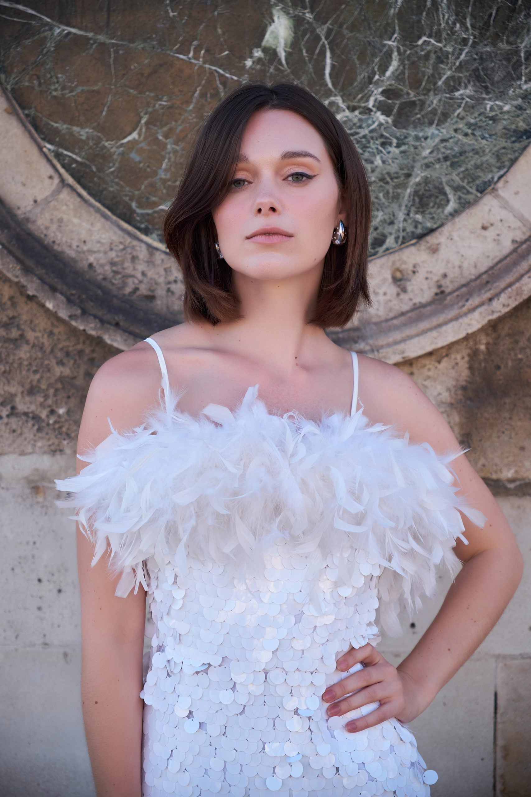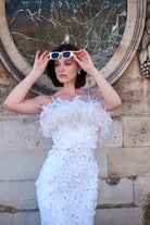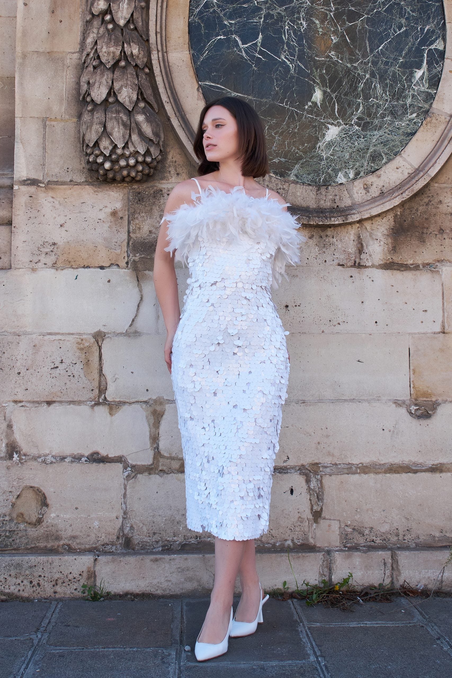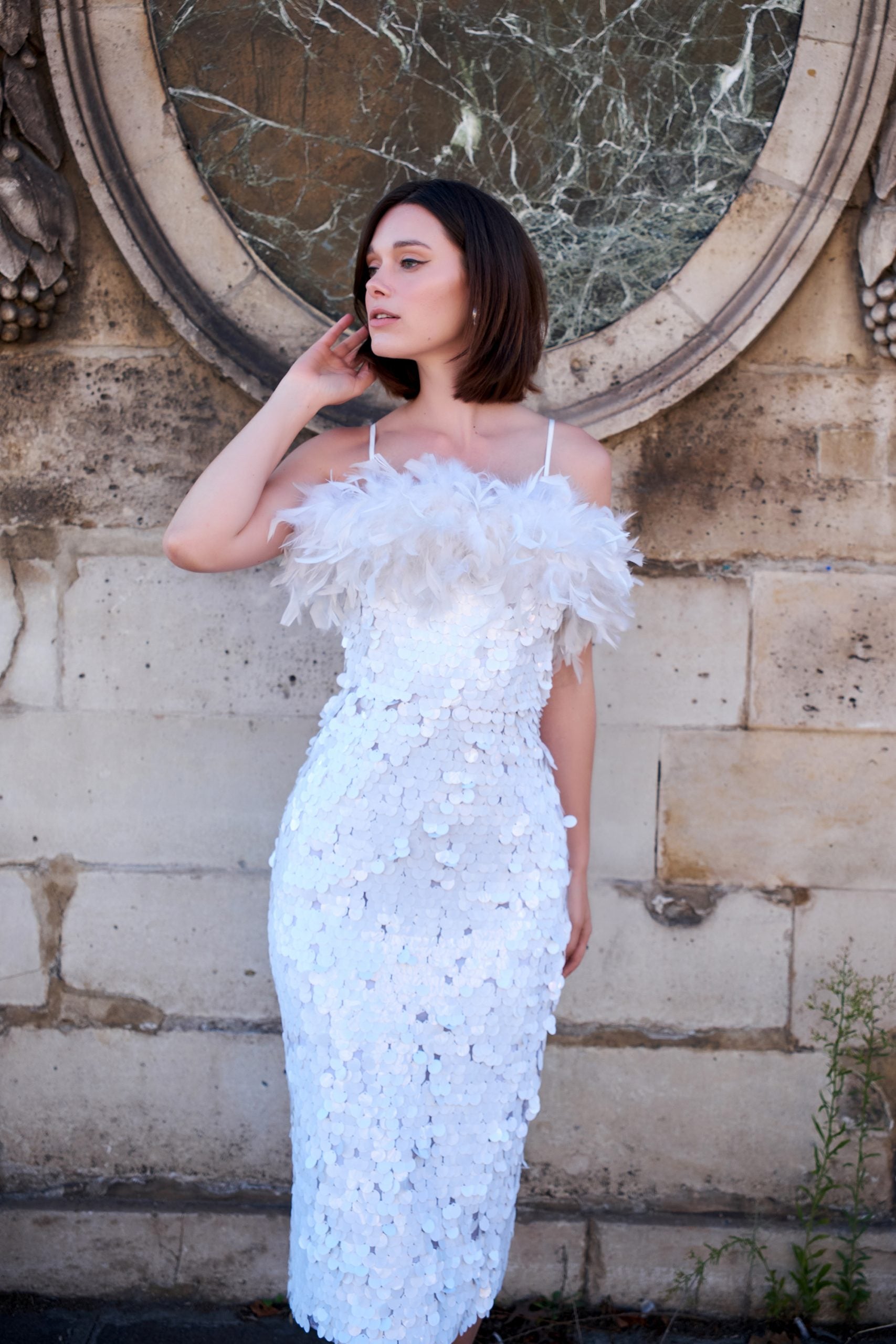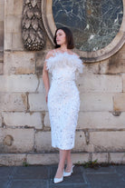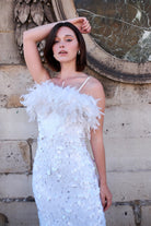 Robe mi-longue blanche à sequins et plumes boa Ariel