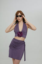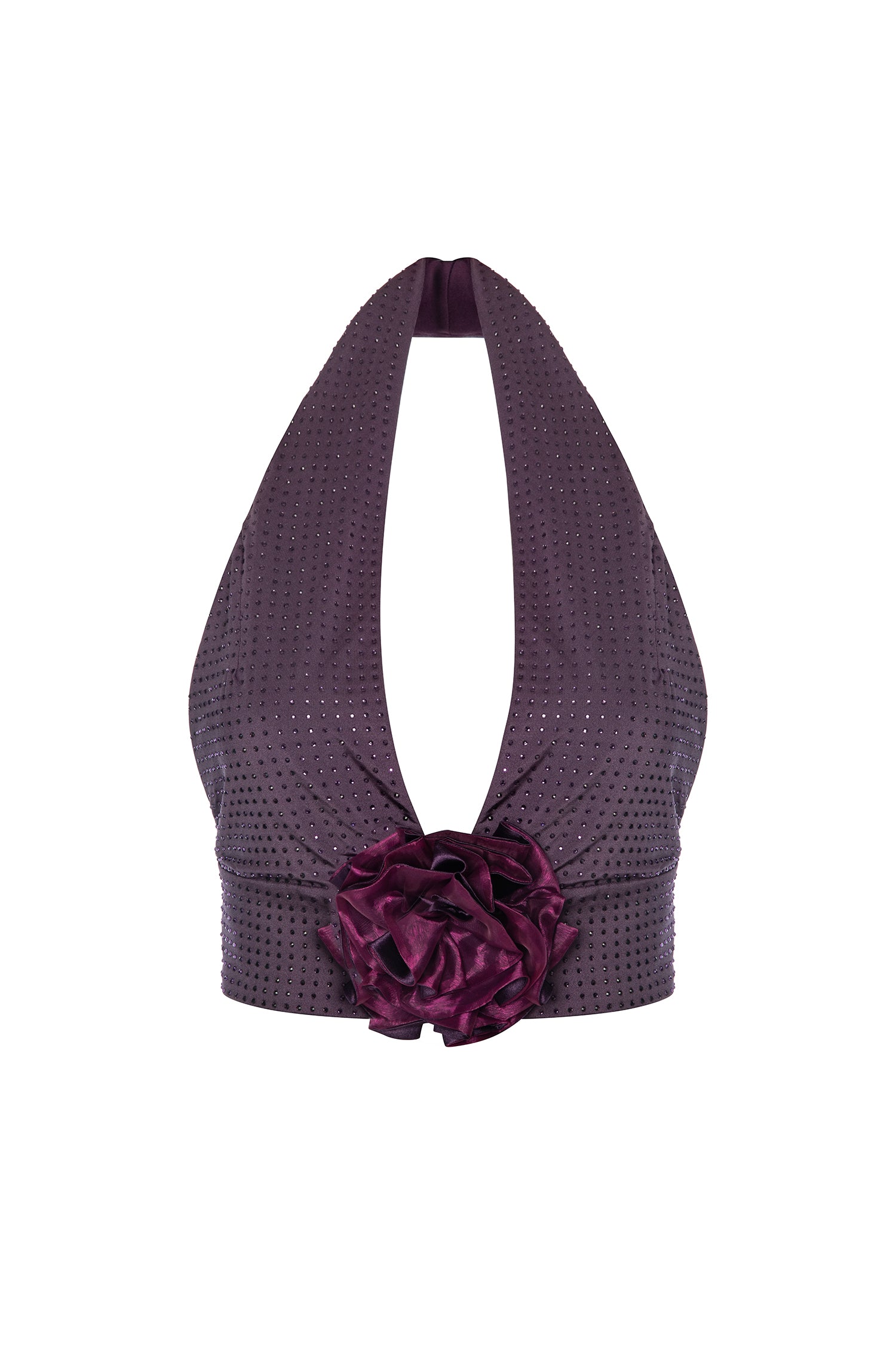 The cristal embellished halter crop top embodies pure sophistication with a bold flower at the front .Features a daring cutout at the front that enhances the silhouette. Fastens at the back of the waist with straichy detailed buttons. Totally lined .This Top brings an effortless edge to any evening look.Pair it with our matching skirt from the same collection for a chic and effortless look or it can be styled with your basics as a star piece.