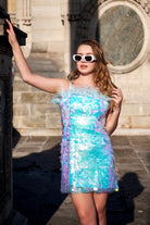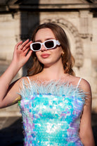 Crafted from premium- quality sequin fabric, this dazzling dress features a fitted bodice , an elegant A-line skirt , and exquisite sequin embellishments that shimmer with every move. . We have created a special adjustable feather detail so that you can easily remove the feathers for washing. The adjustable straps and corset fastening at the back ensure the perfect fit and flattering silhouette.