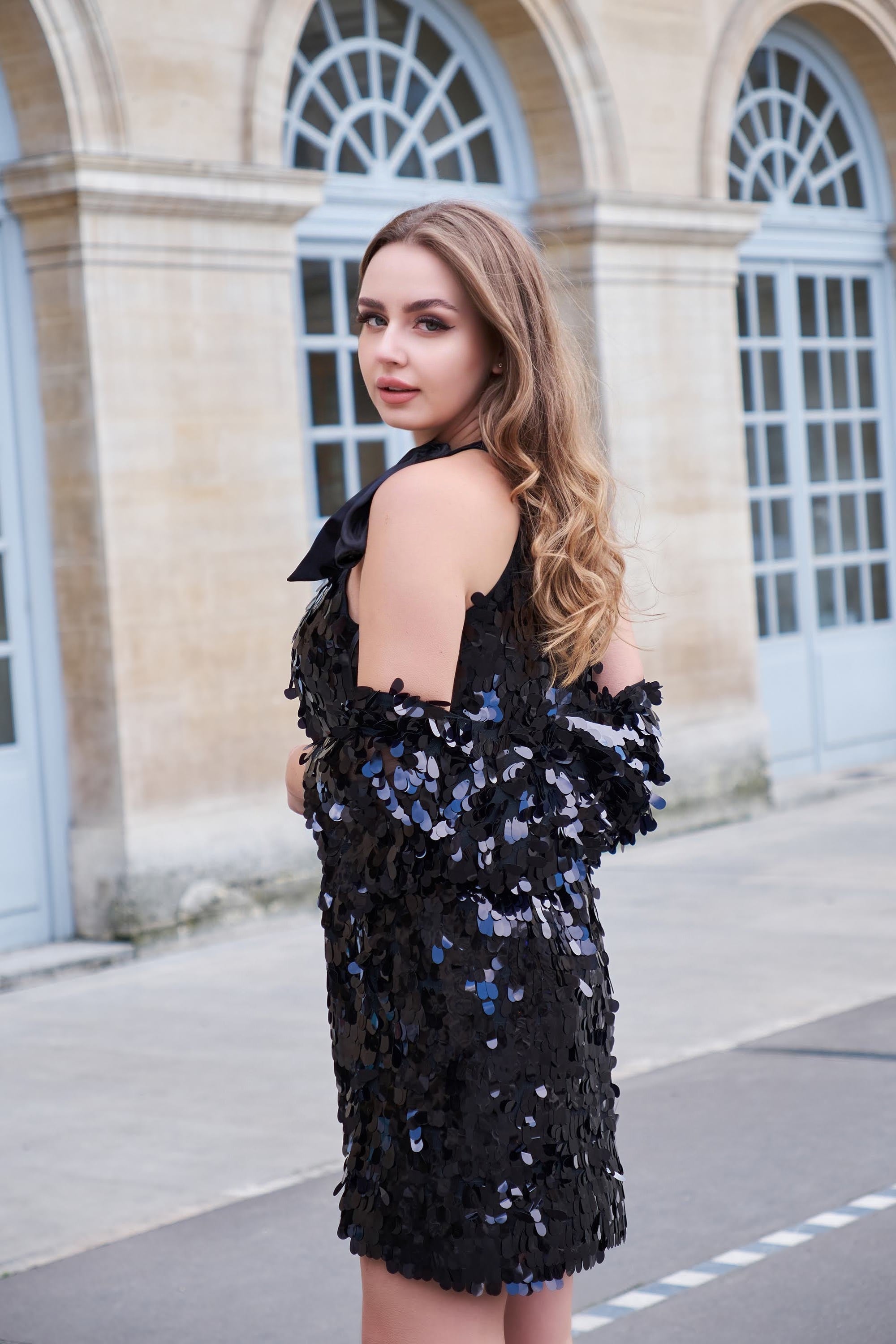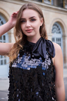 Bring some sparkle. Feel like the centre of attention in our payette mini dress, with unique payette fabric It is tied at the neck . Pair it with heels or cowboy boots for a look that will take you from flawless vacation looks to head turning.