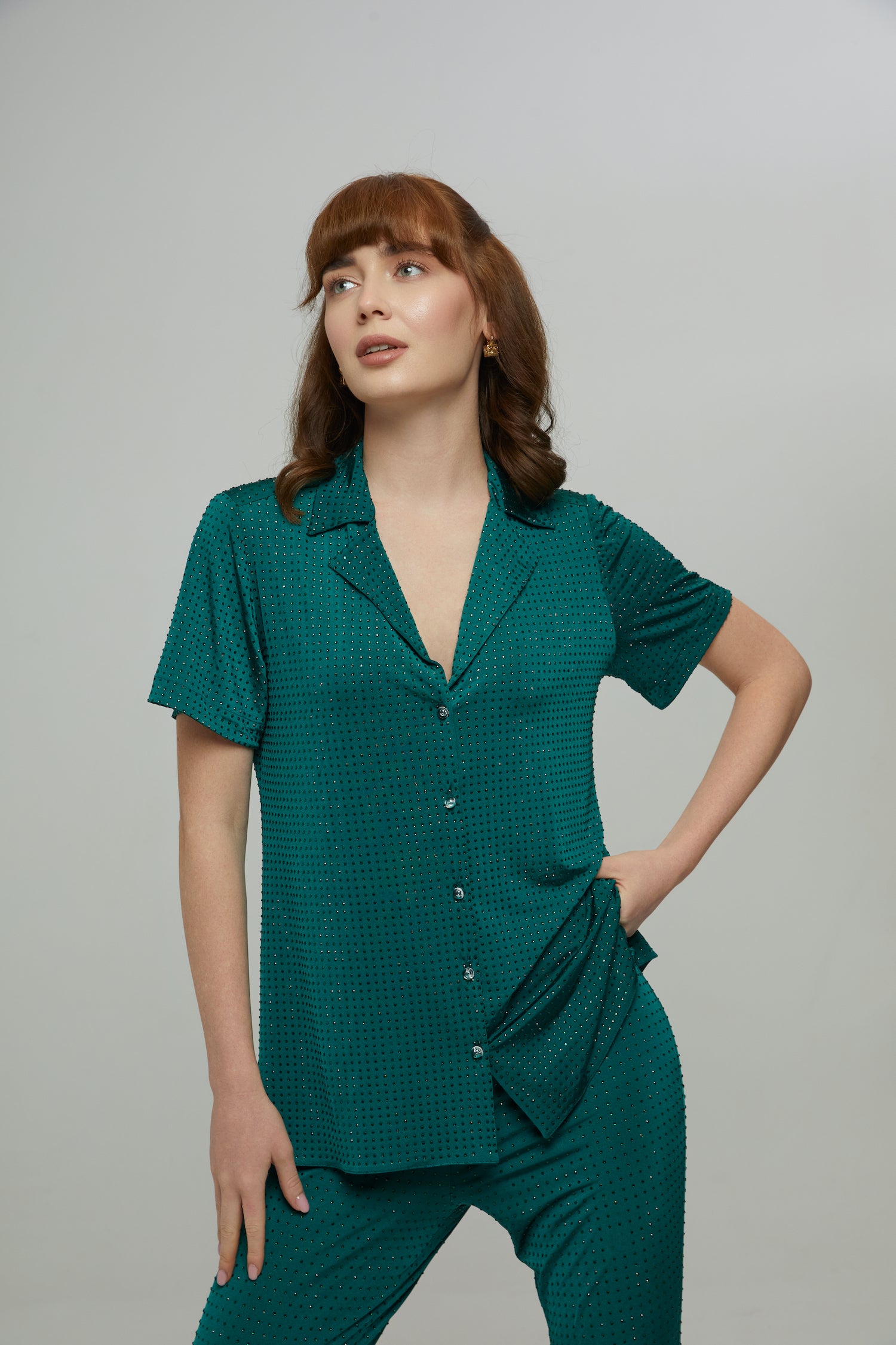 This matching set is a true fusion of luxury and modern edge.  Expertly crafted from premium Lycra fabric adorned  with crystals .The shirt has a loose fit and a button-down collar. The wide-leg trousers have an elastic waistband for extra comfort.Choose this matching set  to stand out in any season and any occasion.