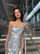 Crafted from premium- quality sequin fabric, this dazzling dress features a fitted bodice , an elegant A-line skirt , and exquisite sequin embellishments that shimmer with every move. Feel fierce in our bold sequin dress styled with own Bolero , made in high quality payette fabric . We have created a special detachable trim detail so that you can easily remove it for washing. The adjustable straps and corset fastening at the back ensure the perfect fit and flattering silhouette.
