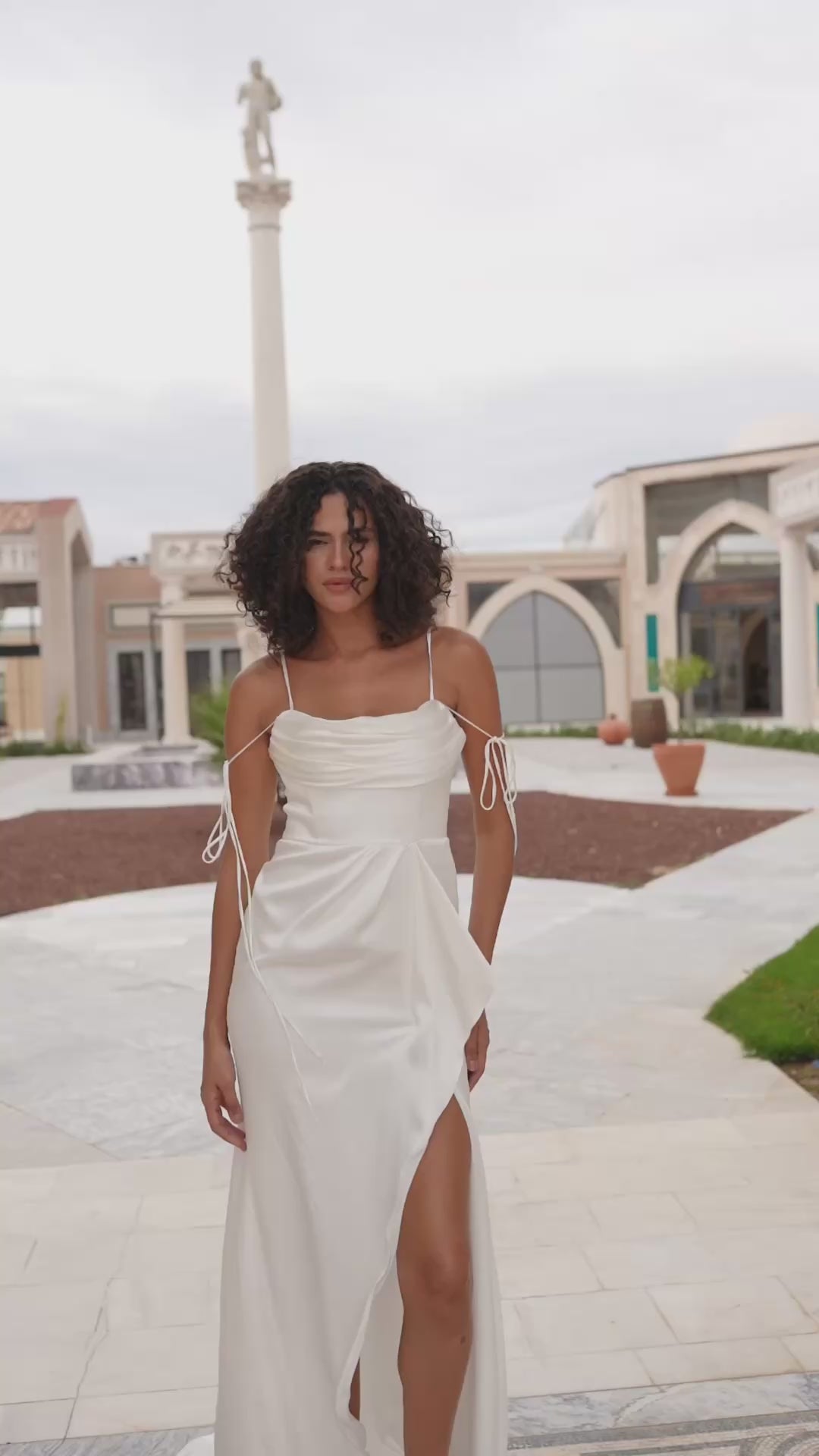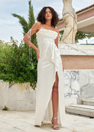 Notable contemporary mermaid gown made of lux Italian silk. The corset features a cinched waist and draped neckline and a structured strapless corset with a lace-up closure on the back decorated with extra long off the shoulder spaghetti straps and a draped skirt with a daring thigh-high split, emphasized by asymmetrical draping. The look is finished with a flowy skirt with a midi train reminiscent of ancient Greek statues.