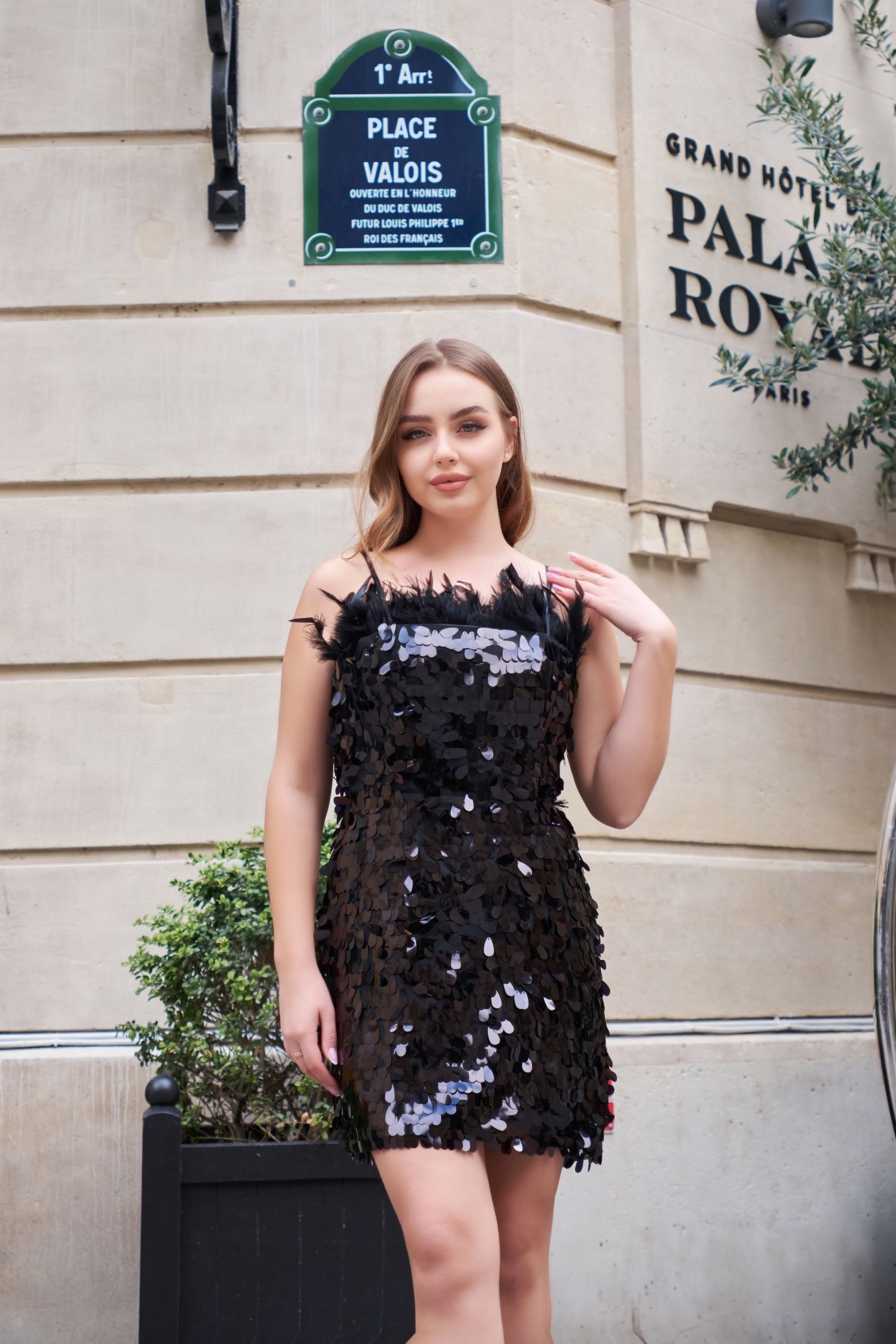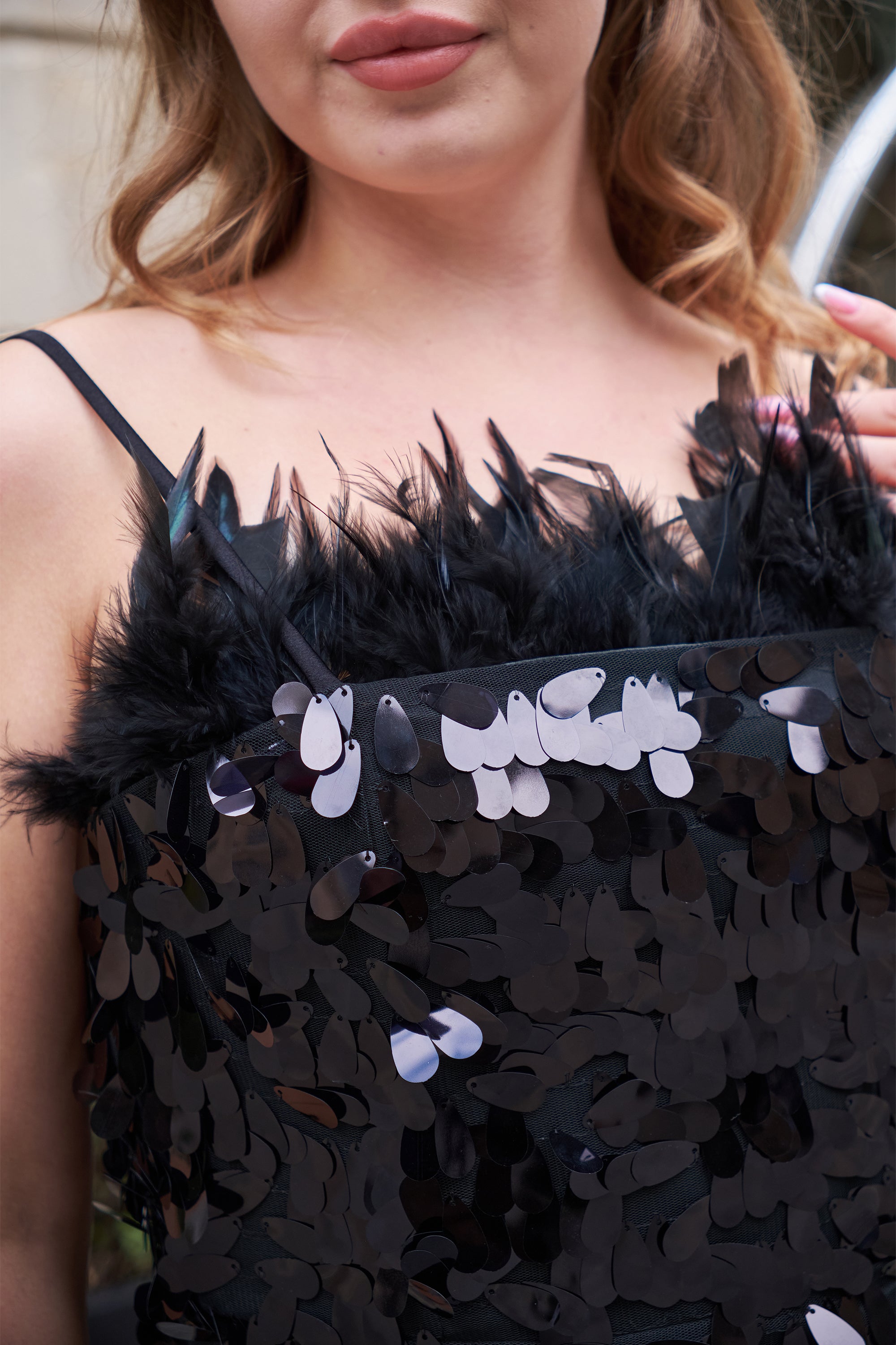 Black payetts are always the right idea. Feel fierce in our bold sequin dress styled with own Bolero , made in high quality sequin fabric .We have created a special adjustable feather detail so that you can easily remove the feathers for washing. This item features a fitted bodice, A- line skirt , premium quality sequin embellishments and corset fastening lacing at the back. This dress will be a perfect black dress with wow effect which you can wear to any kind of event from the day time to formal events and night outs .