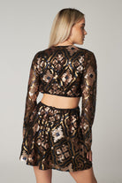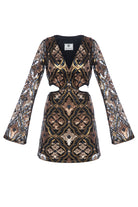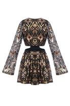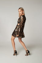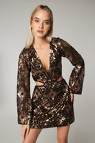 This Matt glistening mini dress is adorned with gold brown sequins on black for a glamorous party look. Long sleeves and side cut-out detailing add a sense of drama to its eye-catching silhouette.