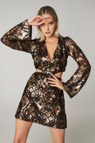 Gold Sequin Long Sleeve Cut Out Mini Dress LERA