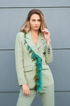 Standard cut mint green jacket and belted high waist trouser suit with ruched detail . This straight , loose cut jacket has an embroidered detail on one side of the collar and pockets on the sides . The trousers are high waisted and belted with fabric buckles. This model is sold as a set. Made from polyester fabric with a matte texture.