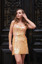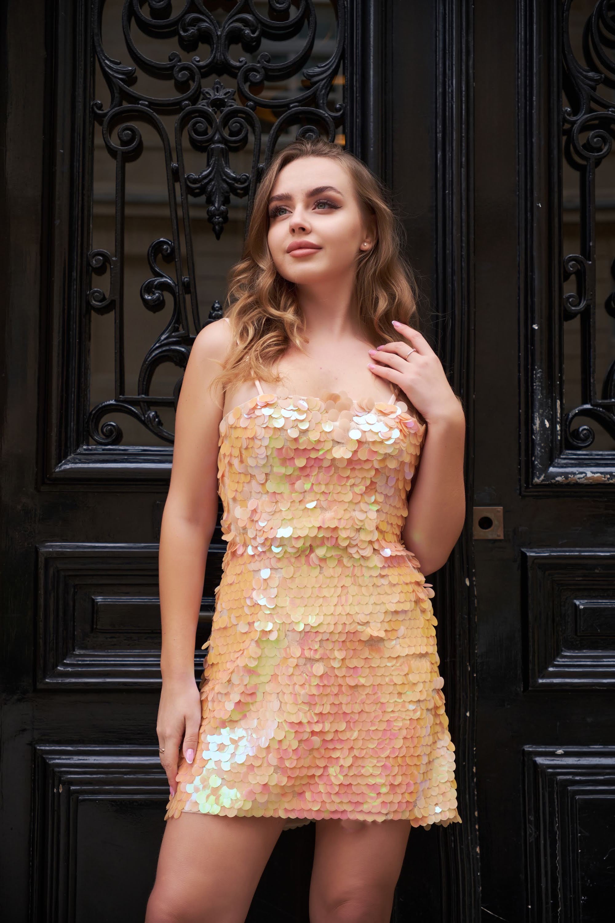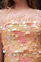 Crafted from premium-quality sequin fabric in a dazzling peach-gold hue, this luminous dress showcases a structured bodice, a graceful A-line skirt, and shimmering sequin embellishments that catch the light from every angle. We have created a special adjustable feather detail so that you can easily remove the feathers for washing. The adjustable straps and lace-up corset back ensure a perfect, customizable fit, enhancing the feminine silhouette with elegance and charm.