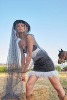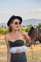 This is a LİMİTED EDİTİON items. The polka-dot cropped bustier can be adjusted to the desired comfort with the tie detail at the back. The fitted mini skirt with white feathers on the front and back is also lined with. Long White on black Polka Dot gloves are also included in the set. Wear these luxurious, flowy items for a bold, daring, yet pretty look.